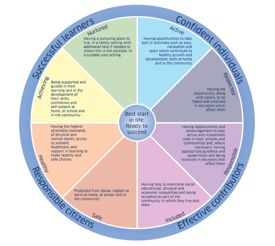 In Prospect Bank we use the SHANARRI wellbeing indicators to record our CPM minutes, inform our planning and to give us a holistic view of each child. The indicators enable us to consider strengths, as well as any obstacles the child may face to growth and development. The Wellbeing Wheel has eight segments formed from the SHANARRI wellbeing indicators. These are: Safe, Healthy, Achieving, Nurtured, Active, Respected, Responsible and Included. At the wheel’s centre is a positive outcome for the child, which is having the best start to life and being ready to succeed. For more information please visit: https://www.gov.scot/policies/girfec/wellbeing-indicators-shanarri/